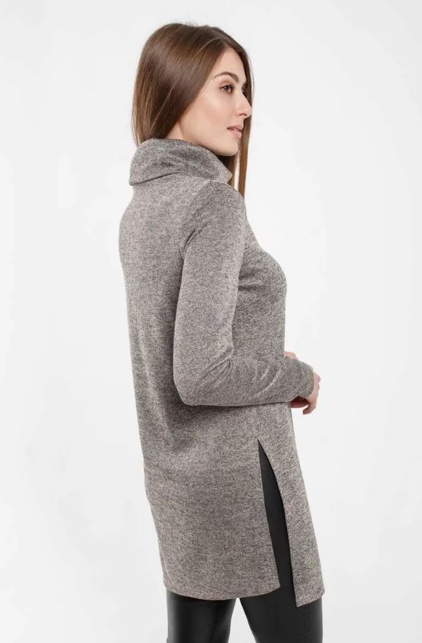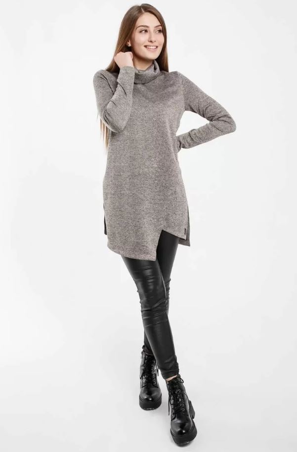 Повседневная женская ассиметричная туника из трикотажного полотна с высоким притачным воротником и двумя разрезами по боковым швам.. Туника прямого силуэта, длиной ниже уровня бедер. Рукав длинный, втачной. Спинка цельная. По переду наклонный шов со складкой от линии груди под проймой - до низа середины переда.