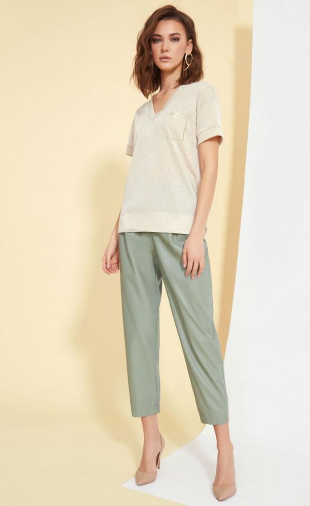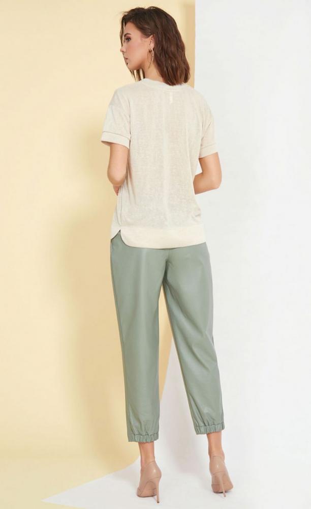 Брюки из эко-кожи на хлопковой основе, прямого кроя слегка зауженные к низу. По переду карманы с наклонным входом. Пояс притачной, по спинке пояса резинка. Застежка на пуговицу и молнию. По низу брюк манжета, задняя часть которой на резинке.