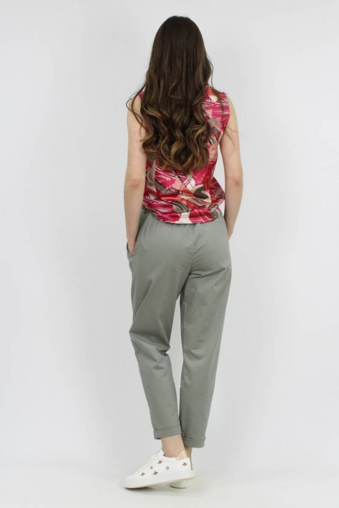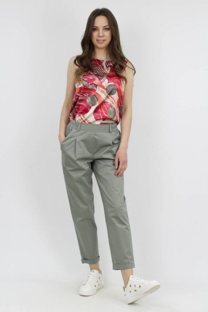 Описание: брюки зауженные, без застежки. Перед с защипом по линии талии, и карманами с отрезным бочком. Низ брюк с манжетой. Спинка с прорезным карманом с правой стороны. Без подкладки. Длина 64см.