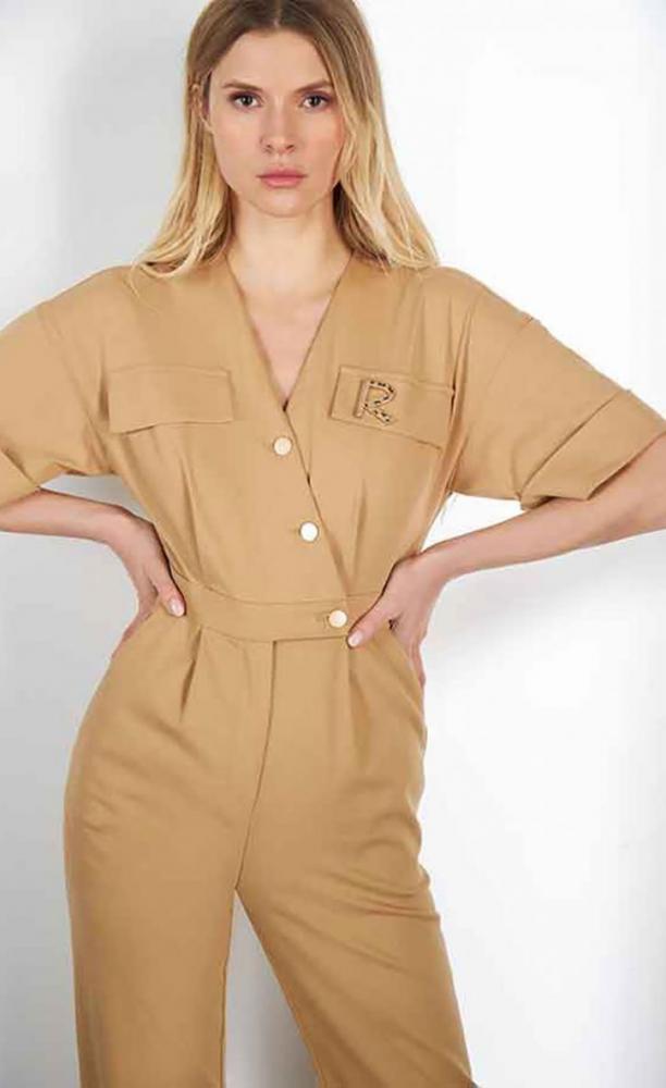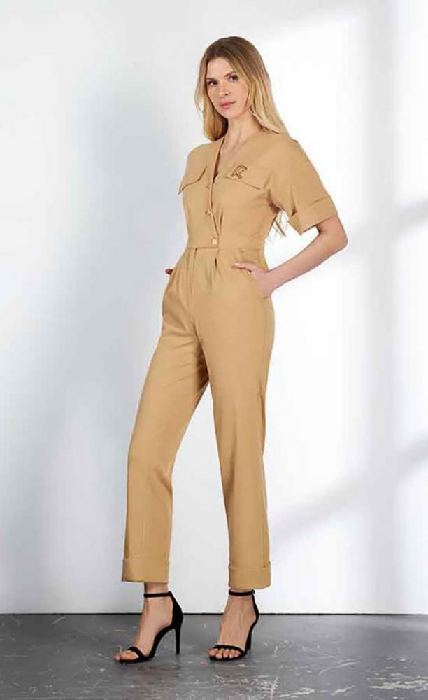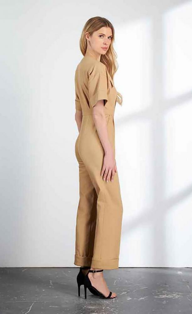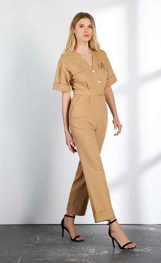 Стильный комбинезон полуприлегающего силуэта со спущенной линией плеча, короткими рукавами с манжетами и прямыми брюками. Отрезной по линии талии, с карманами в боковых швах. Перед лифа с эффектом "на запах", с застёжкой на пуговицы. Универсальная модель, созданная для вашего комфорта.