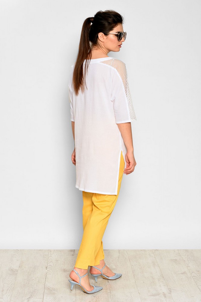 Состав ткани: Блузка: полиэстер 71%, вискоза 27%, эластан 2%; брюки: хлопок 63%, полиэстер 34%, эластан 3%.