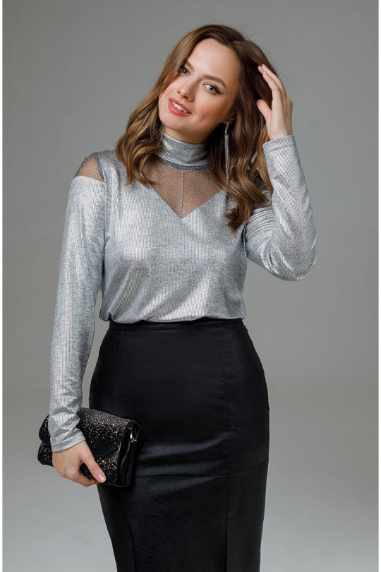 Водолазка из трикотажной ткани с блеском. Втачной рукав, воротник стойка, вставки из прозрачной мерцающей ткани по рукаву и горловине.