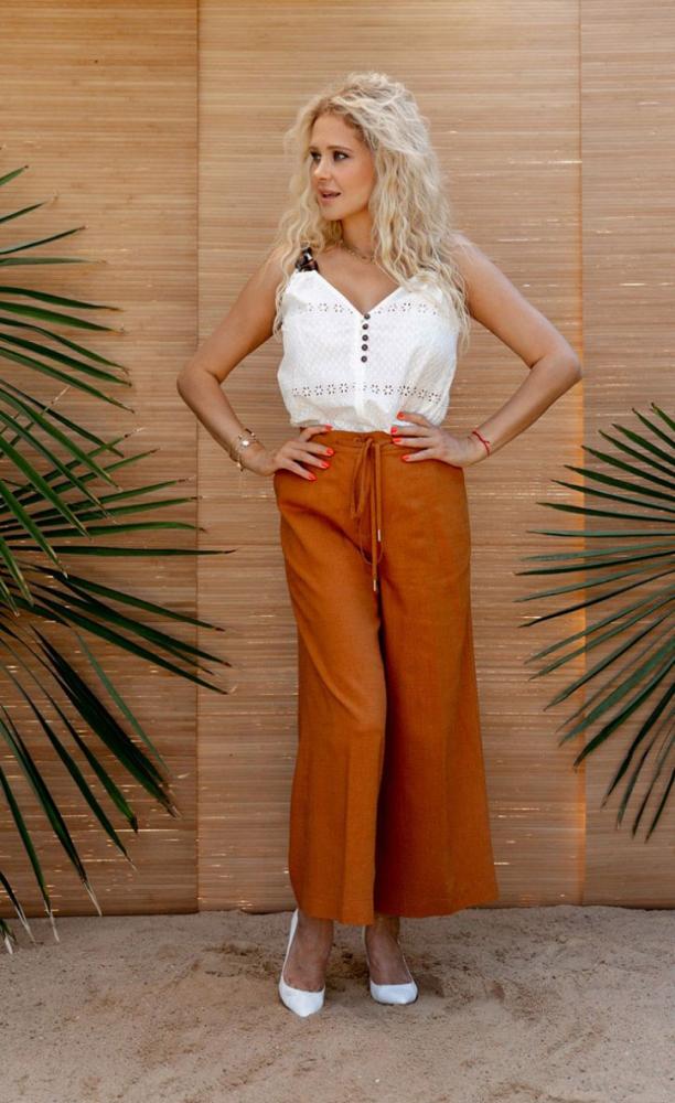 Комплект состоит из жакета, топа и укороченных брюк .Жакет прилегающий, укороченный. Спереди планка с застёжкой на петли и пуговицы, карманы с клапанами. Воротник отложной. Рукав втачной, по низу манжет. Жакет декорирован бахромой по низу и пришивным логотипом на спинке. Топ прямого силуэта, выполнен из хлопковой ткани «шитье», на тонких нерегулируемых бретелях с декоративными бусинами. Бретель в два ряда проходит через кулису. Горловина V-образной формы с застежкой по среднему шву на пять пуговиц и воздушные петли.Брюки прямые с притачным поясом застёгивающимся на петлю и пуговицу. В пояс передних частей брюк вставлены завязки. Застежка на тесьму «молния» по переднему шву. В боковых швах наклонные карманы. Брюки укорочены.
