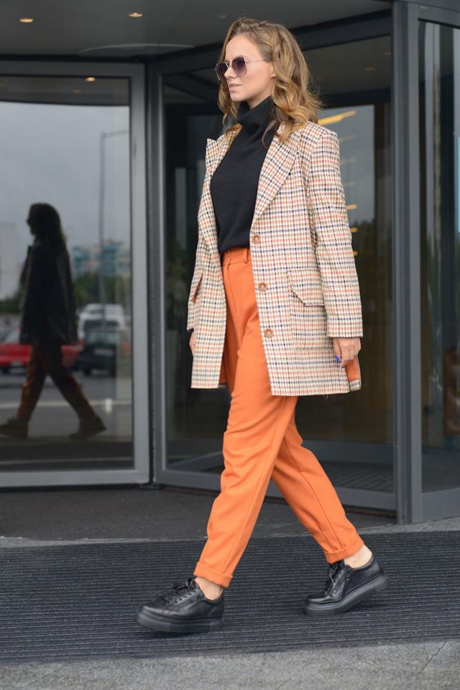 Комплект женский, двухпредметный, состоящий из удлиненного жакета и брюк. Жакет женский, повседневный, прямого силуэта с молниями в боковом шве и застёжкой на три обмётанные петли и пуговицы. Перед с накладными карманами и клапанами. Спинка со средним швом. Рукава длинные, втачные двухшовные. Воротник пиджачного типа, концы воротника и лацкана разные по длине. Жакет на подкладке, притачной по низу. Брюки женские повседневные, зауженные к низу. На передней половинке - складки и боковые карманы, на задней - вытачки по линии талии и прорезные карманы с листочкой. Верхний срез обработан притачным поясом со шлёвками. Застёжка – на тесьму-молния в среднем шве передних половинок и две обмётанные петли и пуговицы. Низ брюк с защипами и отделочной строчкой.