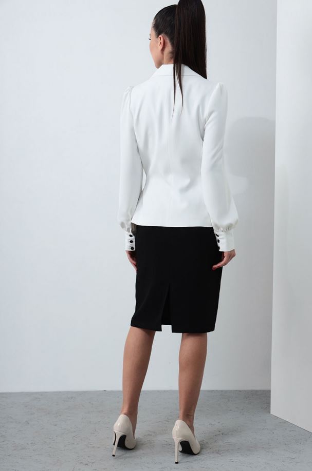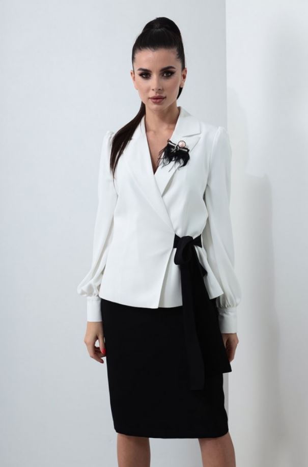 Жакет полуприлегающего силуэта, полочка и спинка на подкладке. По полочке – рельефная вытачка. Притачные бочки по полочке и спинке. Горловина обработана отложным воротником с лацканами в форме «ласточкино крыло», застёжка на завязывающийся пояс в виде банта из отделочной ткани. Рукав – втачной, одношовный, со сборкой по окату и низу, с притачной манжетой, высотой 8см,