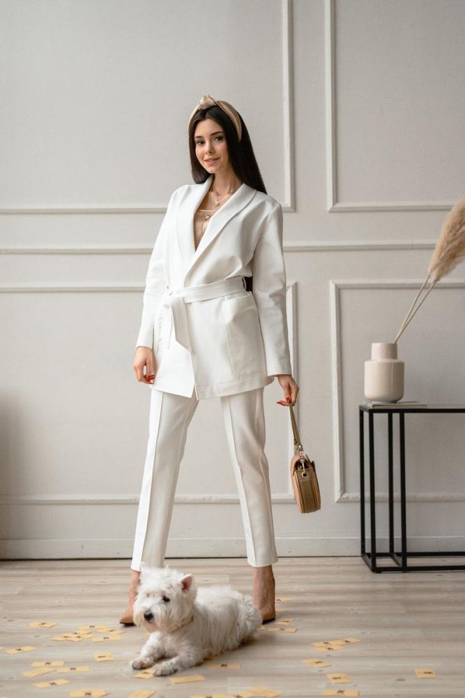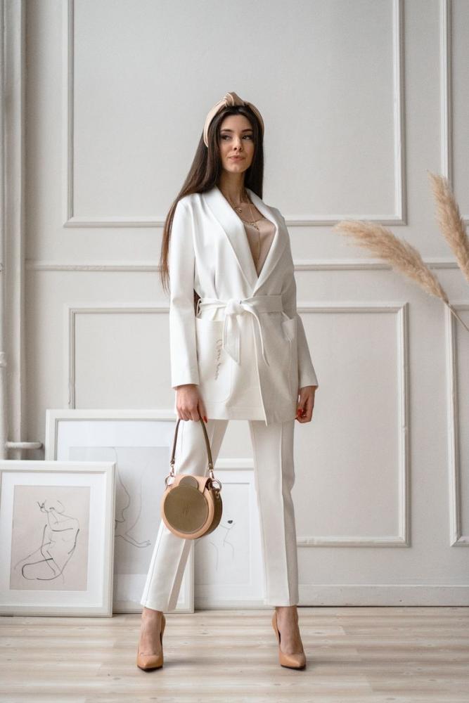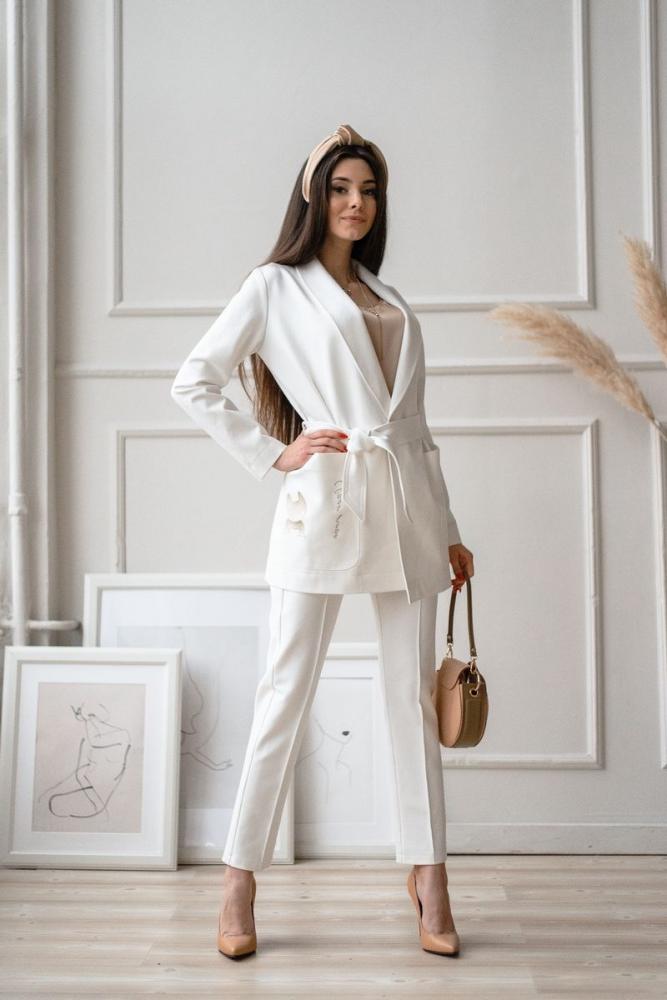 Состав: 70% вискоза, 20% полиэстер, 10% эластан Описание: Элегантный и стильный женский костюм. Состоит из жакета и брюк высокой посадки. Костюм выполнен из плотной костюмной Ткани высокого качества в составе которой вискоза. Карман жакета украшен дизайнерской вышивкой с логотипом. Вышивка выполнена специальными, вышивальными нитками производство Германия. Не окрашиваются.Брюки высокой посадки, прямого кроя, слегка зауженные к низу. Застежка -брючные крючки, молния. Длина брюк стандартная. Костюм подходит, как для ежедневной носки так и для праздничных мероприятий. Костюм выполнен в стиле Спорт шик, что позволяет носить данный комплект, как с классической обувью, так и с обувью в спортивном стиле. Жакет будет отлично дополнять ваше любимое платье, юбку и так же будет отлично смотреться с джинсами.