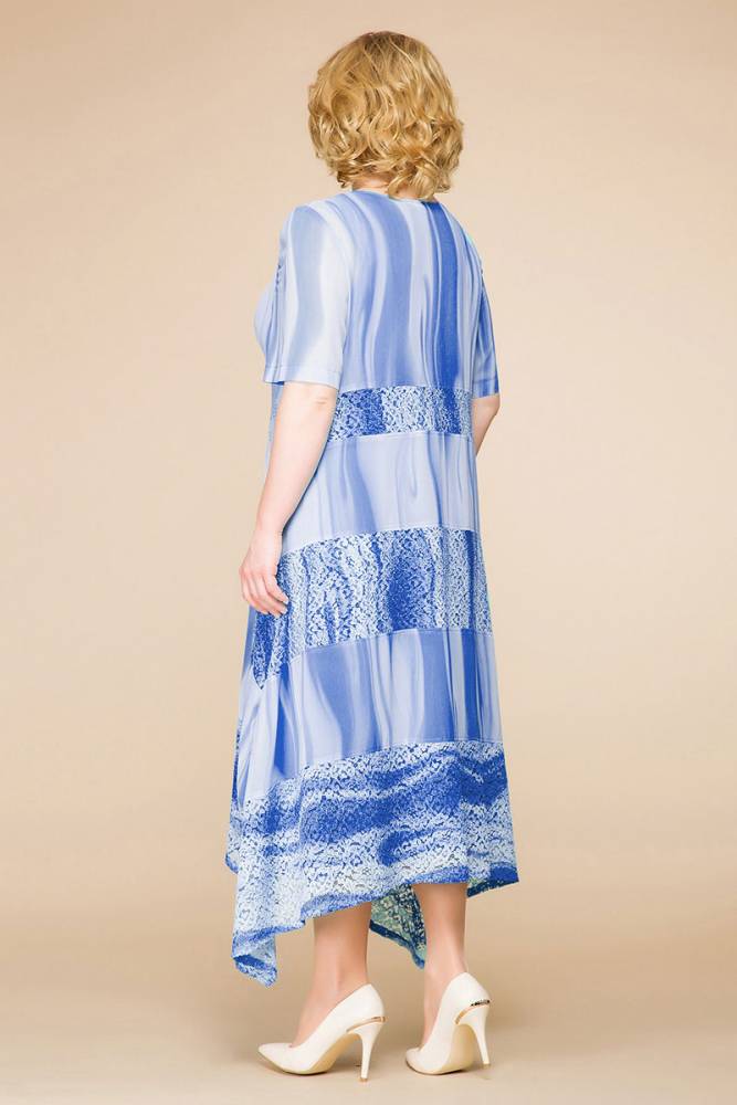 Наряд женский двух предметный, состоящий из платья и платья-чехла, относится к нарядной торжественной одежде.Платье женское, длиной до середины икры, расширенное к низу от линии груди. Центральная часть переда с двумя талиевыми вытачками и декоративной вставки из отделочной ткани,5-ю подрезами, которые чередуются основной и отделочной тканью .Спинка с 5-ю горизонтальными подрезами, которые чередуются как и по переду. Рукав короткий, одно шовный, втачной. Горловина круглая, обтачная, без воротника. Подрез переда декорируется пришивной металлической пластиной. платье с плечевыми накладками. Платье-чехол(нижнее) полуприлегающего силуэта, длиной за колено. Перед с двумя нагрудными вытачками. Спинка со средним швом. Горловина круглая, без воротника, с втачной планкой. Платье без рукавов с втачными планками.
