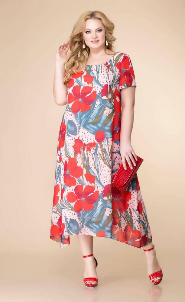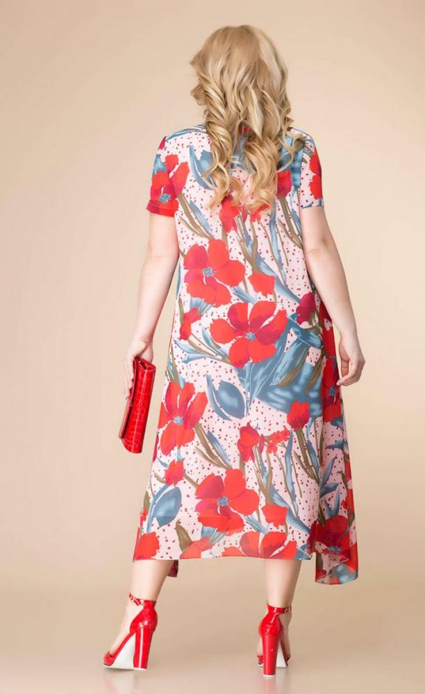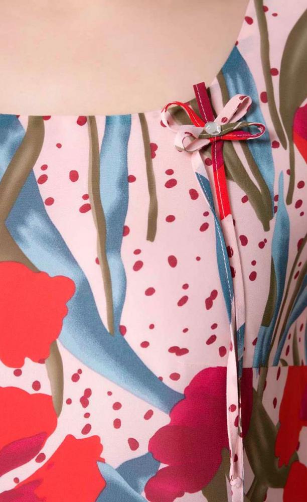Платье женское А-силуэта, длинное, предназначено для повседневной носки. Перед цельнокроенный с двумя нагрудными вытачками. Спинка цельнокроенная. Рукав короткий, одно шовный. Горловина без воротника, круглая, обтачная. Платье на подкладке. Перед платья декорируется пришивными украшениями из ткани, в центре которого одна страза.