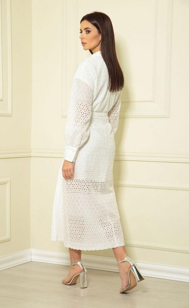 Состав ткани: Хлопок 100%; подкладка: вискоза 100%.Цвет: молоко. Платье-рубашка из хлопкового шитья. Со спущенной линией плеча и защипами на талии по переду и спинке. Застежка на планку с петлями и пуговицами. Воротник стояче-отложной. Рукав одношовный, широкий, присборенный на манжет. Манжет широкий, на две пуговицы. Платье с длиной midi. На подкладке. Наименование измерений Размеры(см) Доп. (см) 42 44 46 48 50 52 откл. +/- Плечевые изделия: Обхват груди 98 100 102 104 1 Обхват талии 68 70 72 74 1 Обхват бедер 108 110 112 116 1 Длина изделия (вдоль середины спинки) 125 125 125 125 1 Длина рукава 45 45 45 45 0,5 Длина рукава с плечом 0,5 Ширина плеча 20 20,5 21 21,5 0,5 Ширина рукава на уровне глубины проймы 38,5 39 39,5 40 1 Ширина рукава по низу 19,5 19,5 20 20 0,5