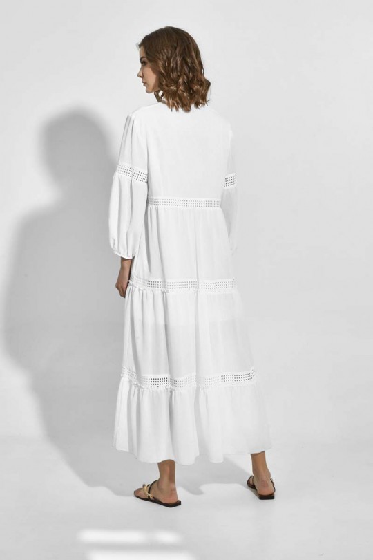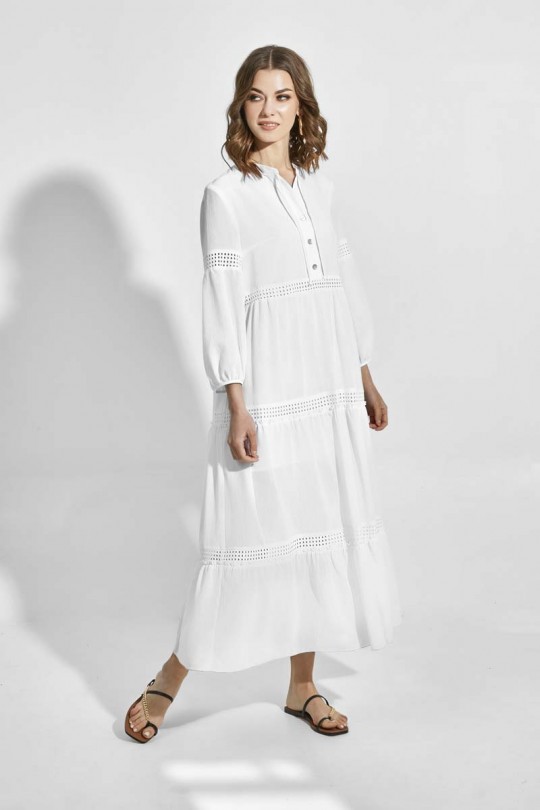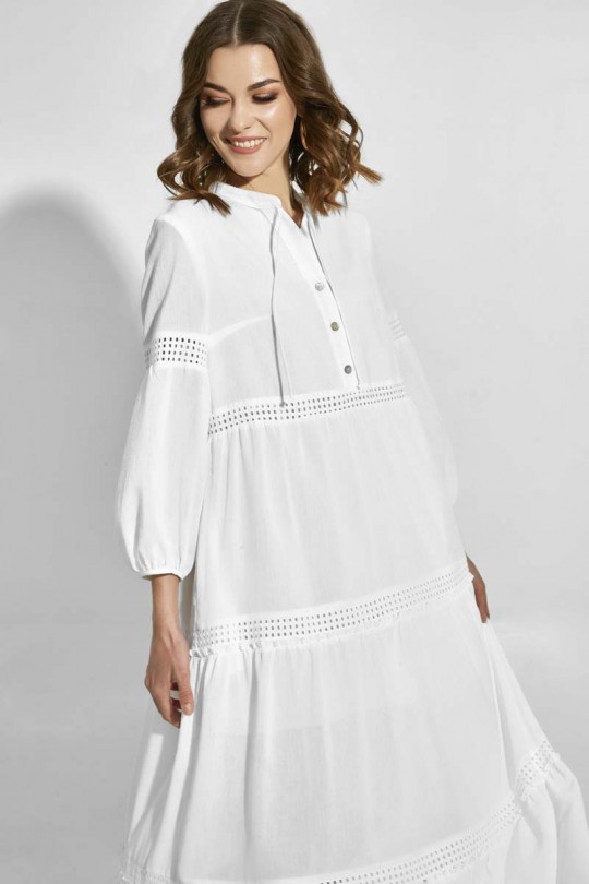 Состав: Хлопок 50%, вискоза 45%, эластан 5%. Цвет: белый. Платье нарядное, свободного силуэта, отрезное под линией груди, карманами в боковых швах, со вставками из отделочной ткани. Верхняя часть переда платья с отрезной планкой, застежкой на пуговицы. Вырез горловины обработан стойкой. Рукав втачной,3/4, со вставкой из отделочной ткани. Длина изделия 128 см. Длина рукава 51 см. обхват груди 86 90 94 102 106 110 обхват талии 82 86 90 94 98 102 обхват рукава 30 32 34 36 38 40