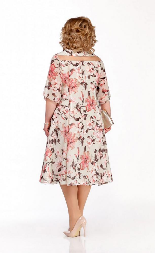 Женское платье прилегающего в области талии силуэта и активно расширенное к низу. Выполнено платье из тонкой струящейся ткани. По переду и спинке есть вертикальные рельефы. Воротник – отложная стойка, выполненная на горловине «лодочка». По переду и спинке есть фигурная кокетка, которая выполнена из полупрозрачной сетки. Рукав втачной одношовный. Застежка на потайную тесьму-молнию располагается в боковом шве. Платье на подкладке.