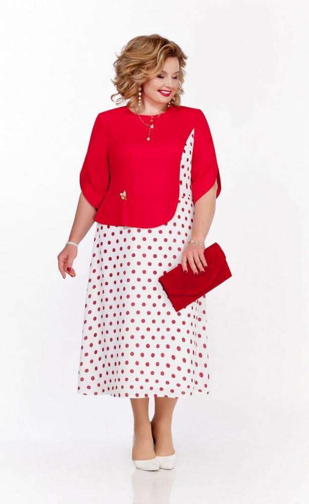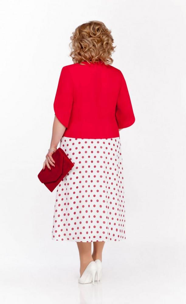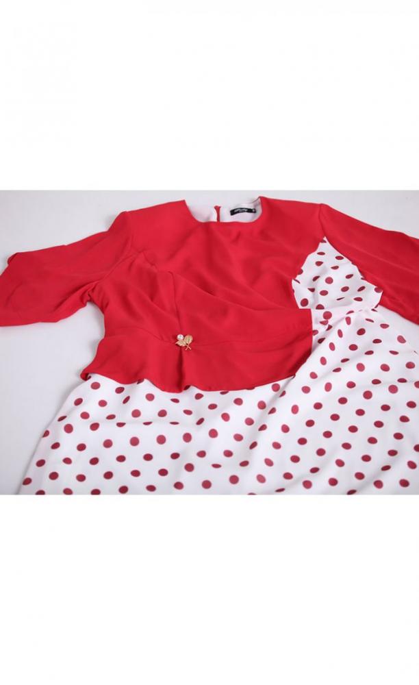 Женское платье, прилегающего в области талии силуэта и активно расширенное к низу. Выполнено из плательной струящейся ткани на сочетании однотона и дизайна в горохи. По переду платье имеет горизонтальный подрез по линии талии. Есть вертикальные рельефы из проймы. Линия правого рельефа плавно переходит в отлетную ассиметричную баску по переду. Подрез по спинке находится на уровне низа баски. Вырез горловины округлый. Рукав втачной одношовный, с разрезом по центру, который имеет закругленные края. Платье декорировано съемной брошью. Изделие на подкладке.