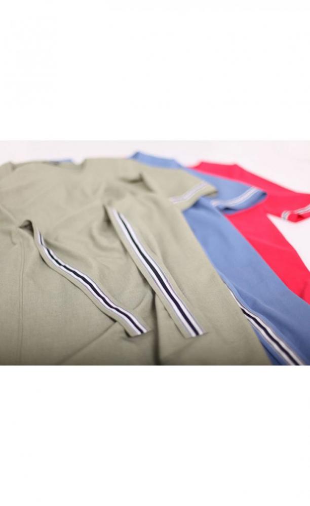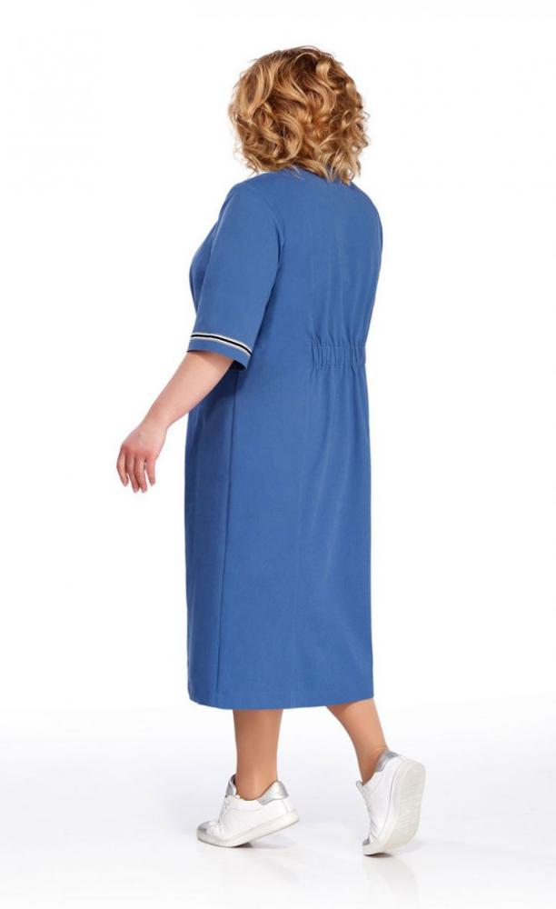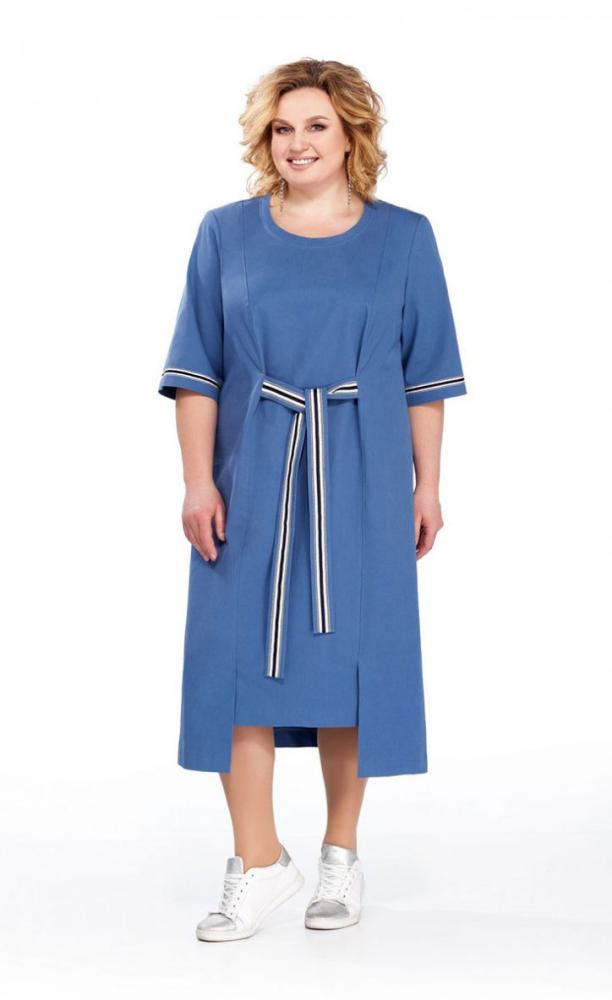 Платье прямого силуэта из плательно-костюмной ткани. На переде и на спинке обработаны вертикальные рельефы из плеча. Округлая горловина декорирована узкой бейкой из основной ткани. Центральная часть переда короче боковых деталей и внизу рельефы оканчиваются шлицами. Рукава и пояски переда декорированы тесьмой. Центральная деталь спинки в области талии собрана на резинку.