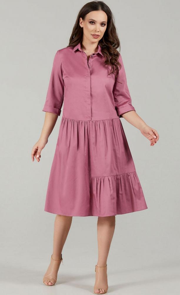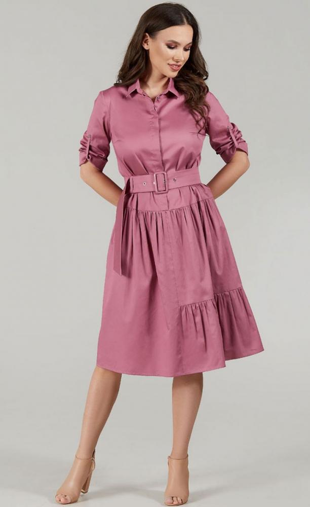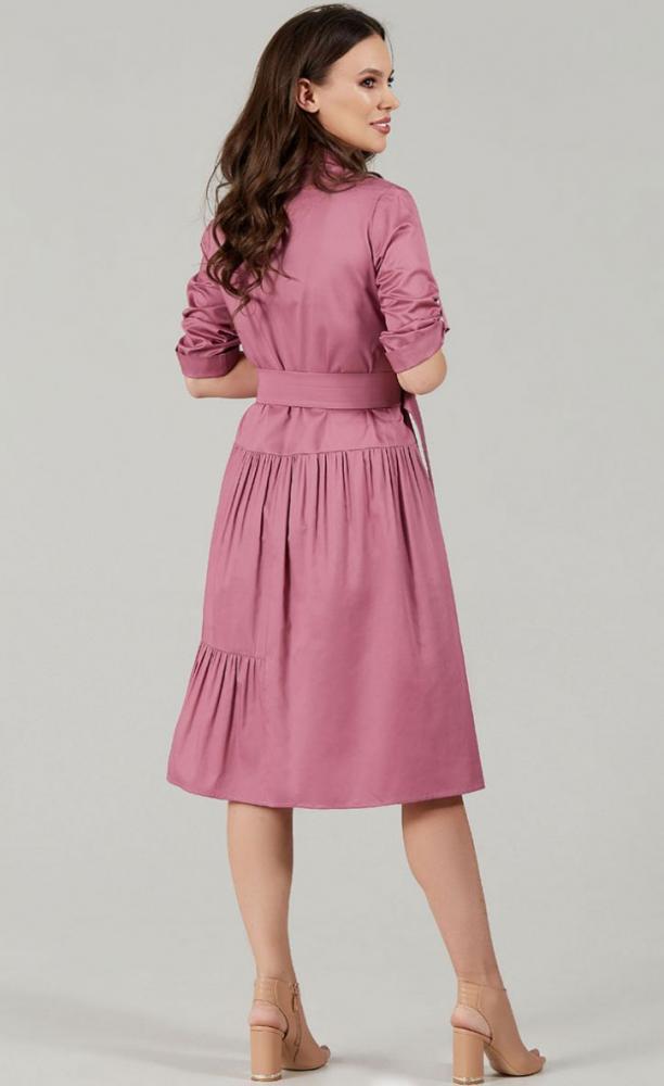 Платье прямого силуэта без подкладки, отрезное ниже линии талии. По переду лифа расположены нагрудные вытачки, обрпботана потайная застежка. Спинка цельнокроеная. Юбка платья выполнена из ассимитричных ярусов, присборенных по верхним срезам. Горловина обработана стояче-отложным воротником с отрезной стойкой. Рукава втачные одношовные с притачной широкой манжетой, длина регулируется патой, застегивающейся на петлюи пуговицу. Платье комплектуется съемным поясом из основной ткани.