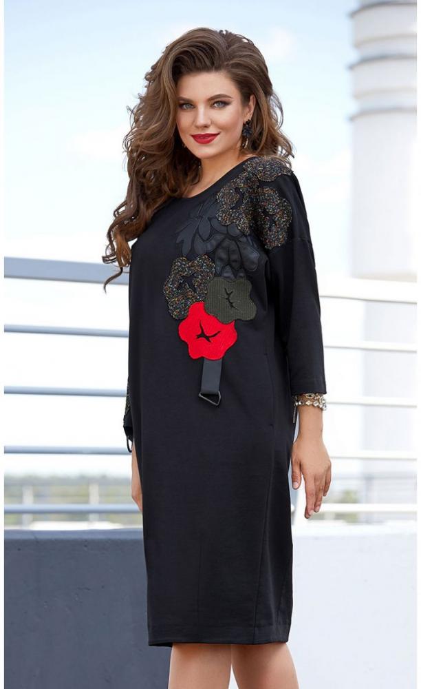 Платье - мгновенный хит. В сочетании с яркими акцентами чёрный цвет смотрится особенно эффектно. Красивая вышивка- шик! Платье свободного силуэта овал со спущенной линией плеча. По переду с левой стороны расположена вышивка- аппликация, в низу изделия выполнены силуэтные вытачки, вырез горловины округлой формы, обработан бейкой. По спинке расположена V- образная вставка из сетки и имитация застёжки с пришивными пуговицами, в низу изделия расположены силуэтные вытачки. В боковых швах обработаны карманы. Рукав втачной со спущенной линией плеча.